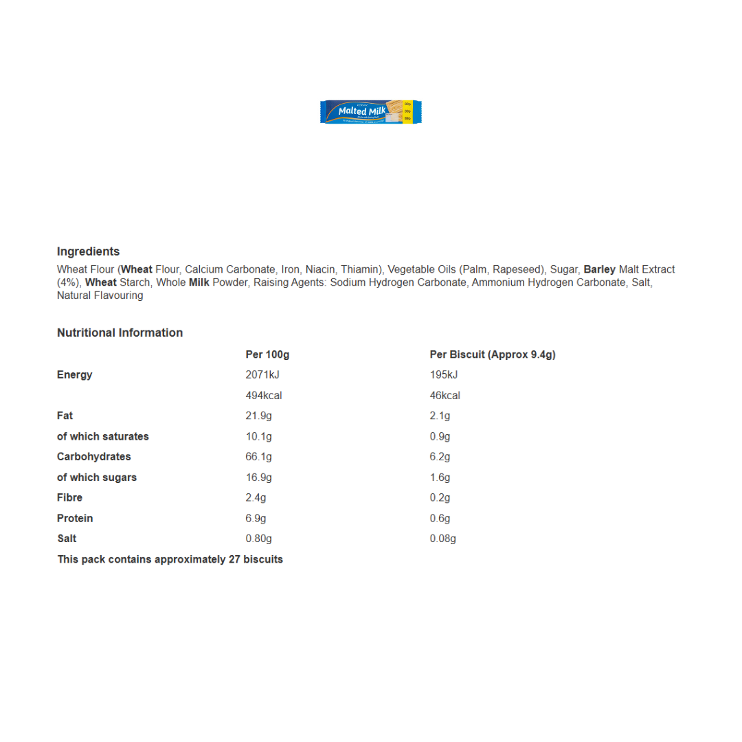 Classic malted milk biscuits with a rich, slightly sweet malt flavour and crisp texture. Perfect for dipping in tea or enjoying as a quick snack.