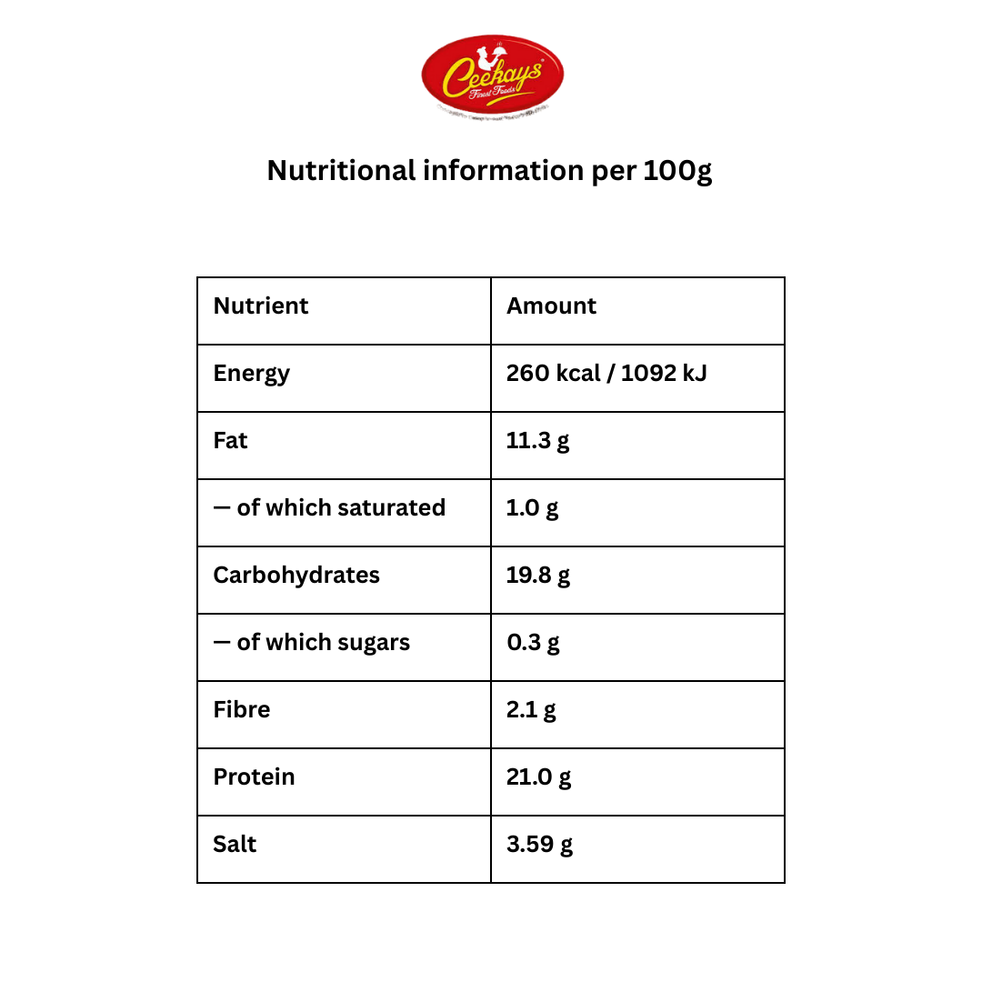 Enjoy zesty, bite-sized chicken fillets coated in citrus-infused Peri Peri breadcrumbs with a mellow heat—perfect for snacks, party platters, wraps, or salads.