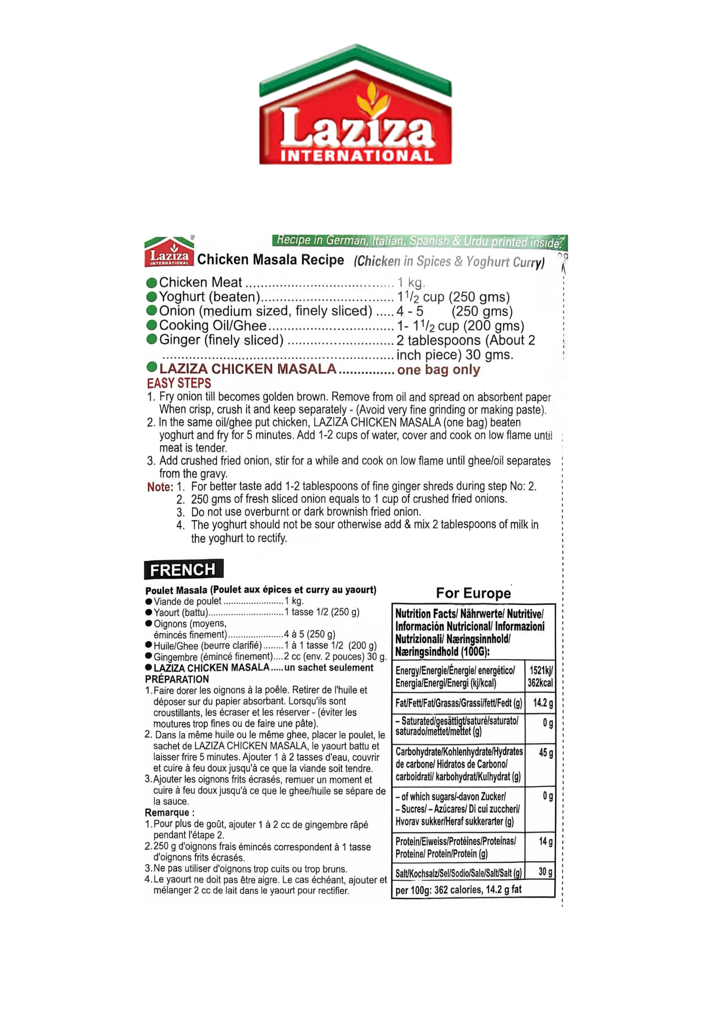 Laziza Chicken Masala is a premium spice blend designed to bring the authentic flavors of traditional chicken curry to your kitchen. Infused with a rich mix of spices, this masala ensures a fragrant, flavorful, and aromatic chicken curry every time.