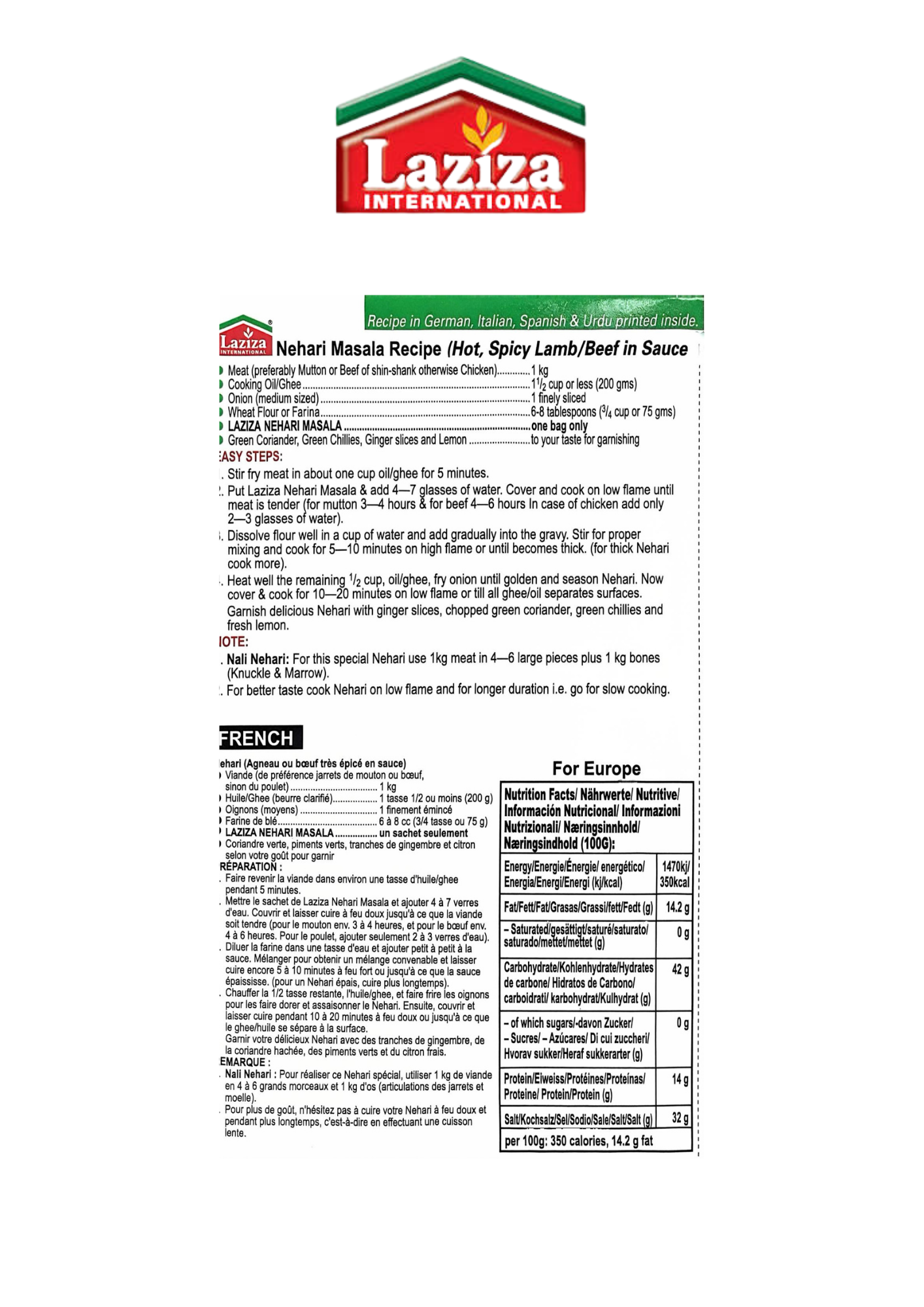 Laziza Nihari Masala is a premium spice blend designed to bring the authentic flavors of traditional Nihari to your kitchen. Infused with a rich mix of spices, this masala ensures a fragrant, flavorful, and aromatic Nihari every time.