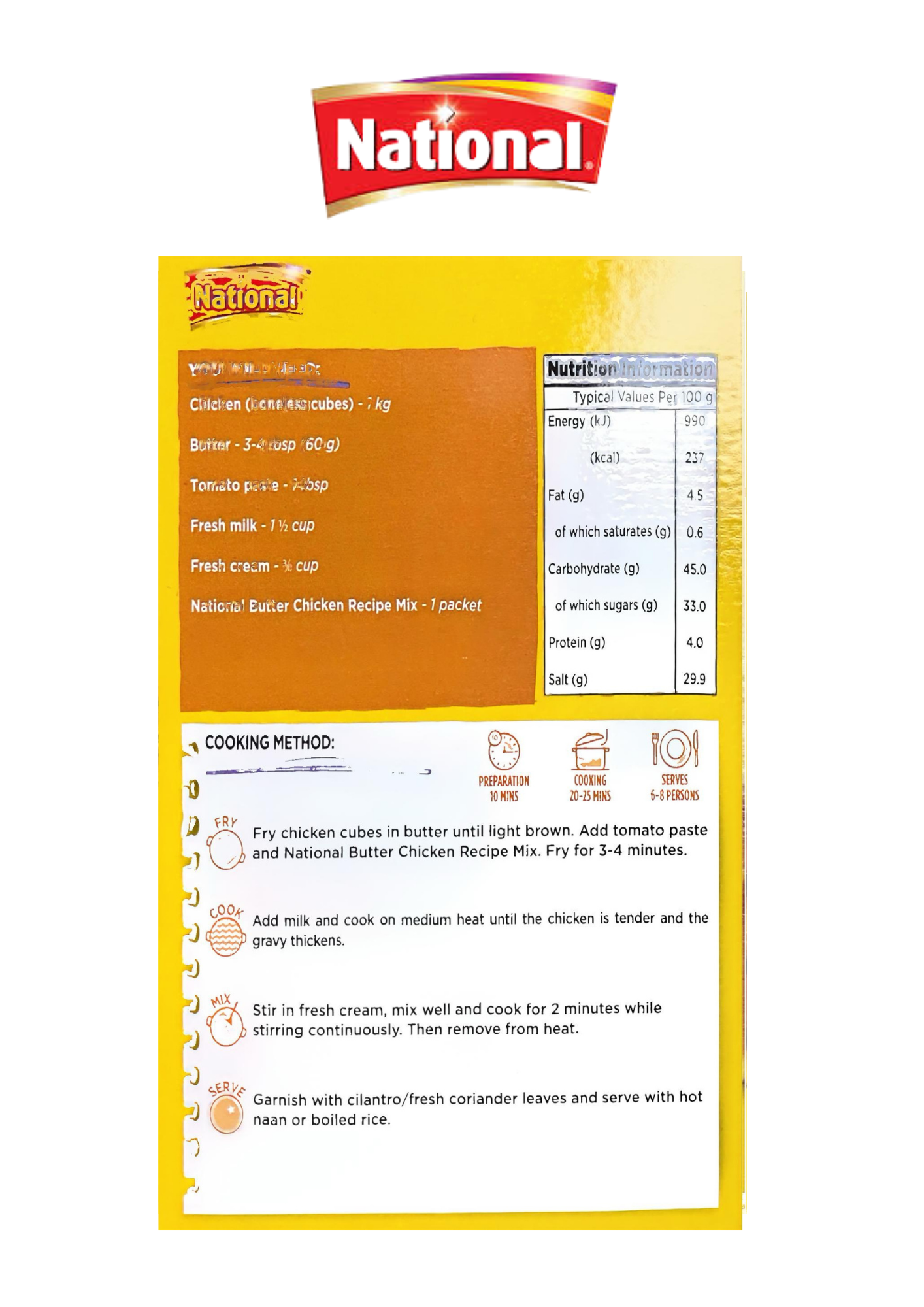 National Butter Chicken Recipe Mix is a rich and aromatic blend of spices that helps you recreate the famous restaurant-style butter chicken at home. With its creamy, mildly spiced, and buttery flavor, this mix perfectly balances tangy tomatoes, warm spices, and a hint of sweetness. A family favorite that turns everyday chicken into a luxurious dish.