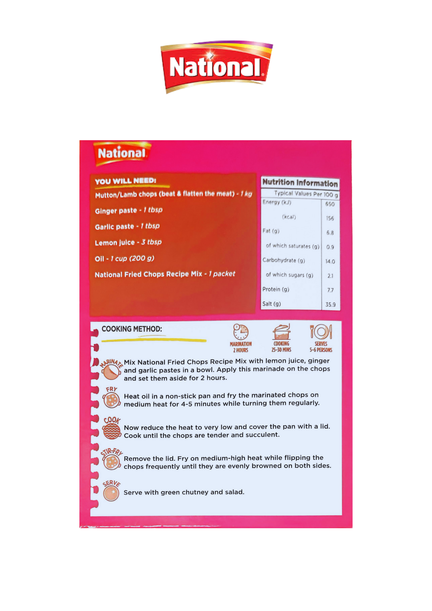 National Fried Chops is a versatile spice blend designed for coating and frying meat chops, creating a crispy, flavorful crust. This mix combines robust spices like black pepper, paprika, garlic, and herbs to enhance the taste of lamb, chicken, or pork chops. Perfect for easy, restaurant-style fried chops at home!