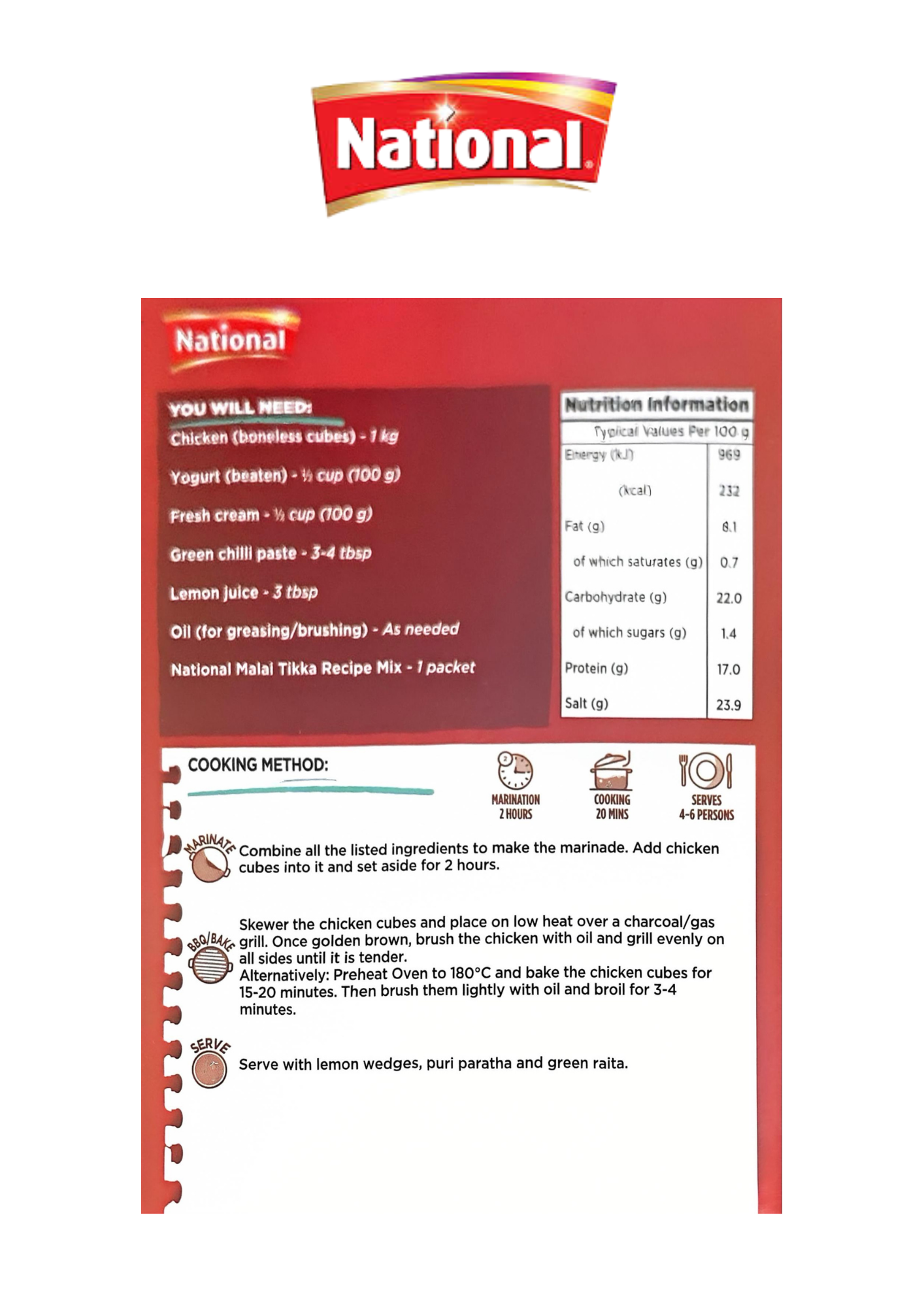 National Malai Tikka is a rich and creamy spice blend designed for marinating tender chicken pieces in the classic Mughlai-style malai tikka. This mix combines cashew cream, yogurt, cheese, and aromatic spices like cardamom, mace, and rose petals to create a delicate, creamy, and mildly smoky flavor. Perfect for succulent, melt-in-the-mouth grilled chicken!