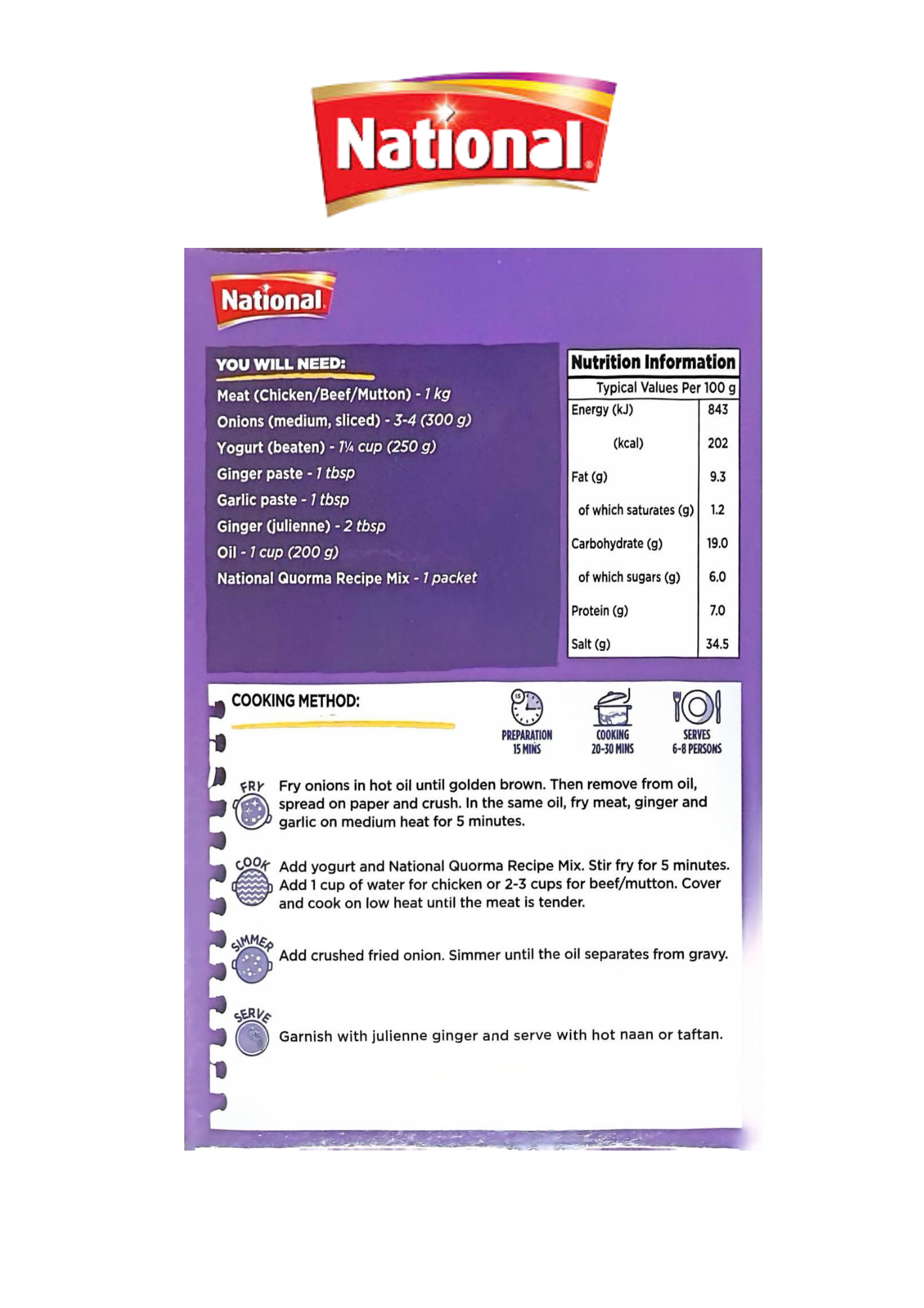 National Quorma Recipe Mix is a luxurious spice blend crafted for creating rich, creamy, and aromatic quorma curry. This mix combines delicate spices like cardamom, cloves, cinnamon, and nutmeg with yogurt and cream-based notes to achieve a balanced, mildly sweet, and fragrant gravy. Perfect for pairing with chicken, lamb, or vegetables!
