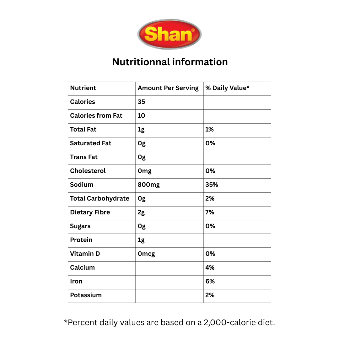 Red Chili, Salt, Turmeric, Coriander, Fennel, Fenugreek Leaves, Cumin, Cinnamon, Bay Leaf, All Spice, Nigella Seed, Black Pepper, Ginger, Green Cardamom, Maltodextrin, Hydrolyzed Soy Protein, Citric Acid, Cane Sugar, Canola Oil, Silicon Dioxide (Anticaking Agent).