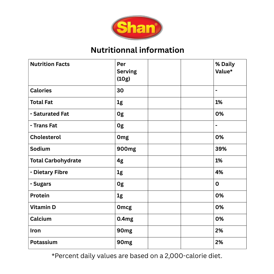 Salt, Red Chili, Turmeric, Cumin, Black Pepper, Large Cardamom, Cinnamon, Green Cardamom, Clove, Ginger, Garlic, Star Aniseed, White Pepper, Tartaric Acid, Citric Acid, Soya, Maltodextrin, Hydrolyzed Soy Protein, Sugar, Canola Oil, Silicon Dioxide.