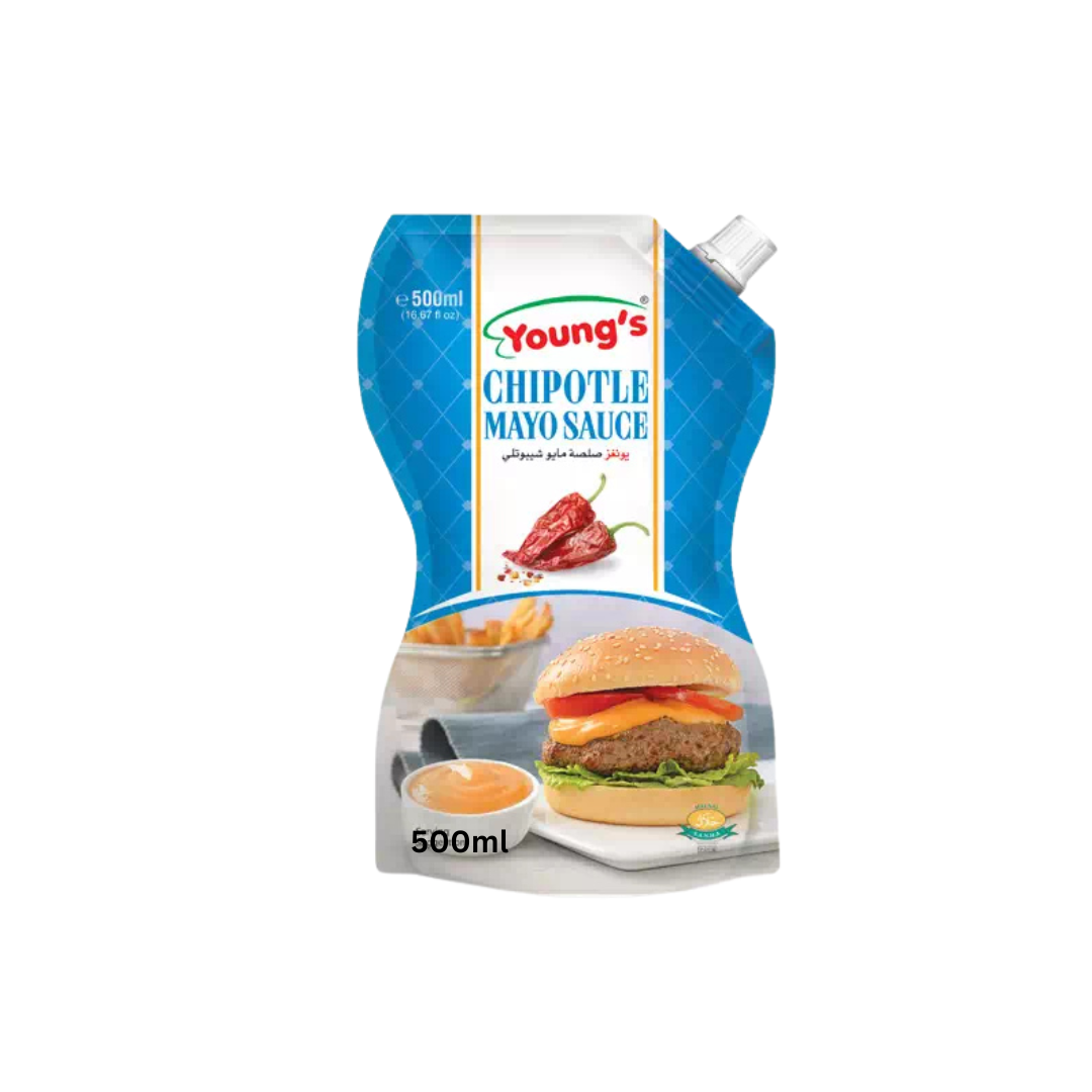 Young's Chipotle Mayo Sauce 500ml. A smoky, spicy, and creamy blend of mayo and chipotle peppers. The perfect versatile condiment for tacos, burgers, and dipping. Your new flavour obsession!
